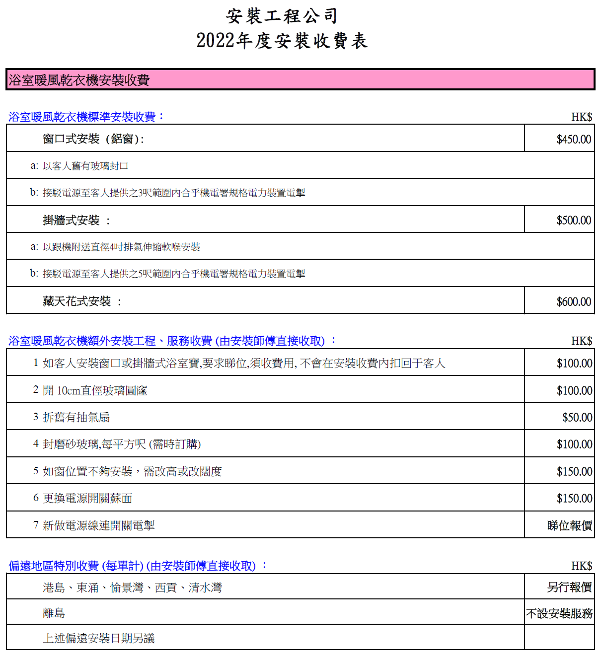 2022年安裝收費表