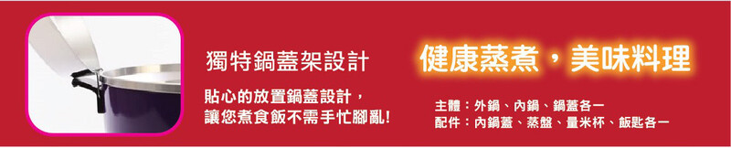 功率: 600 W 保溫電功率: 40W 份量: 6人份 台灣製造 * 鍋蓋,內鍋,內鍋蓋,蒸盤均為 * 食品級SUS#304不銹鋼材質 * 具保溫切換開關,免拔插頭 * 雙重覆蓋電源線,雙重安全保護 * 煮飯 / 粥,蒸,滷,燉多用途 * 主體:外鍋、內鍋、鍋蓋各一 * 主體:外鍋、內鍋、鍋蓋各一 * 配件:內鍋蓋、蒸盤、量米杯、飯匙各一