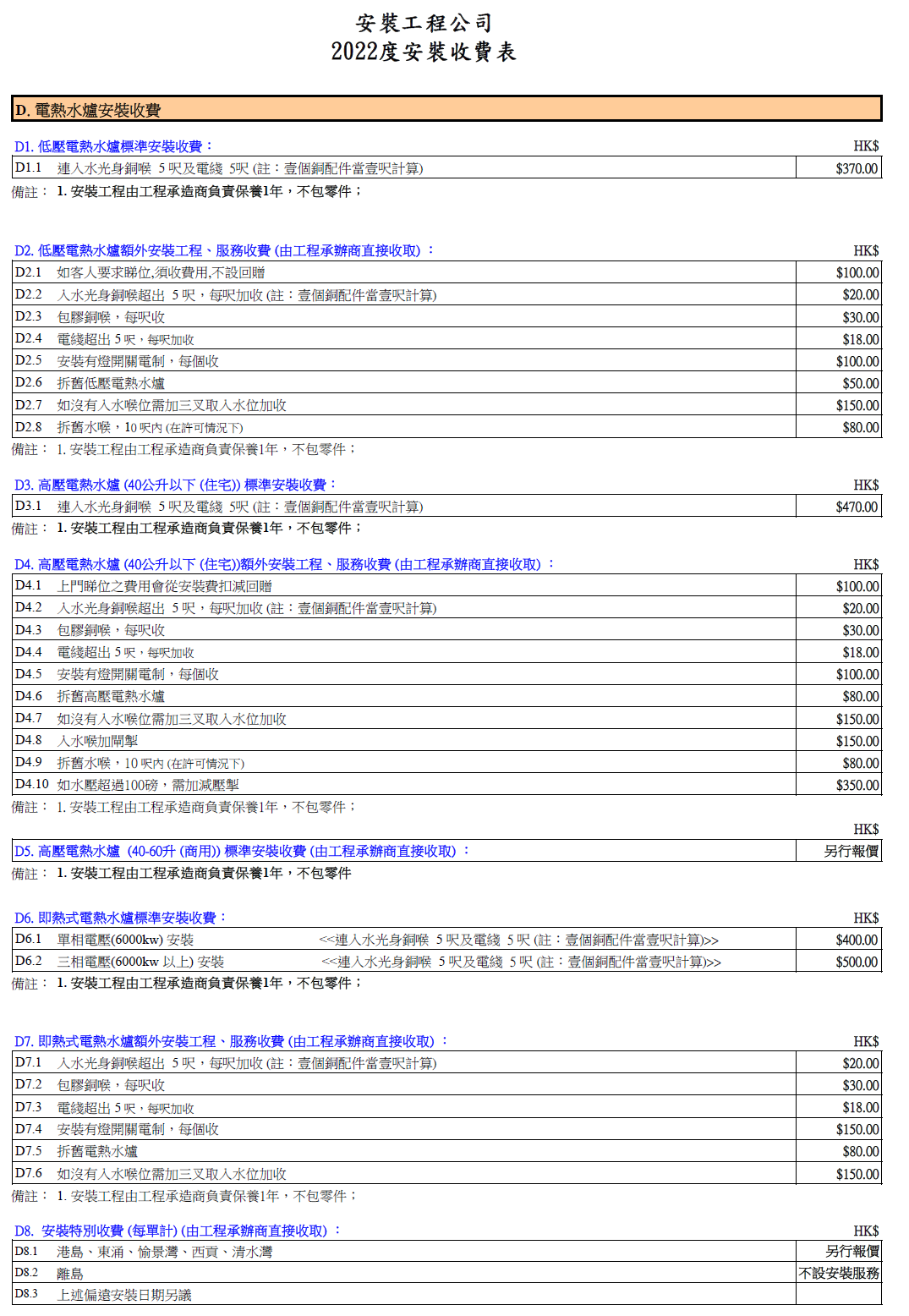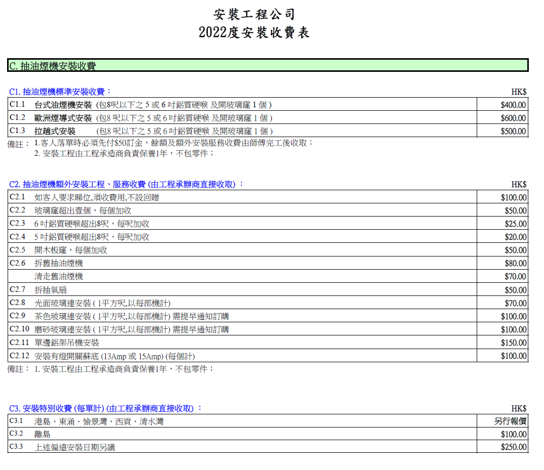 2022年安裝收費表